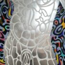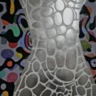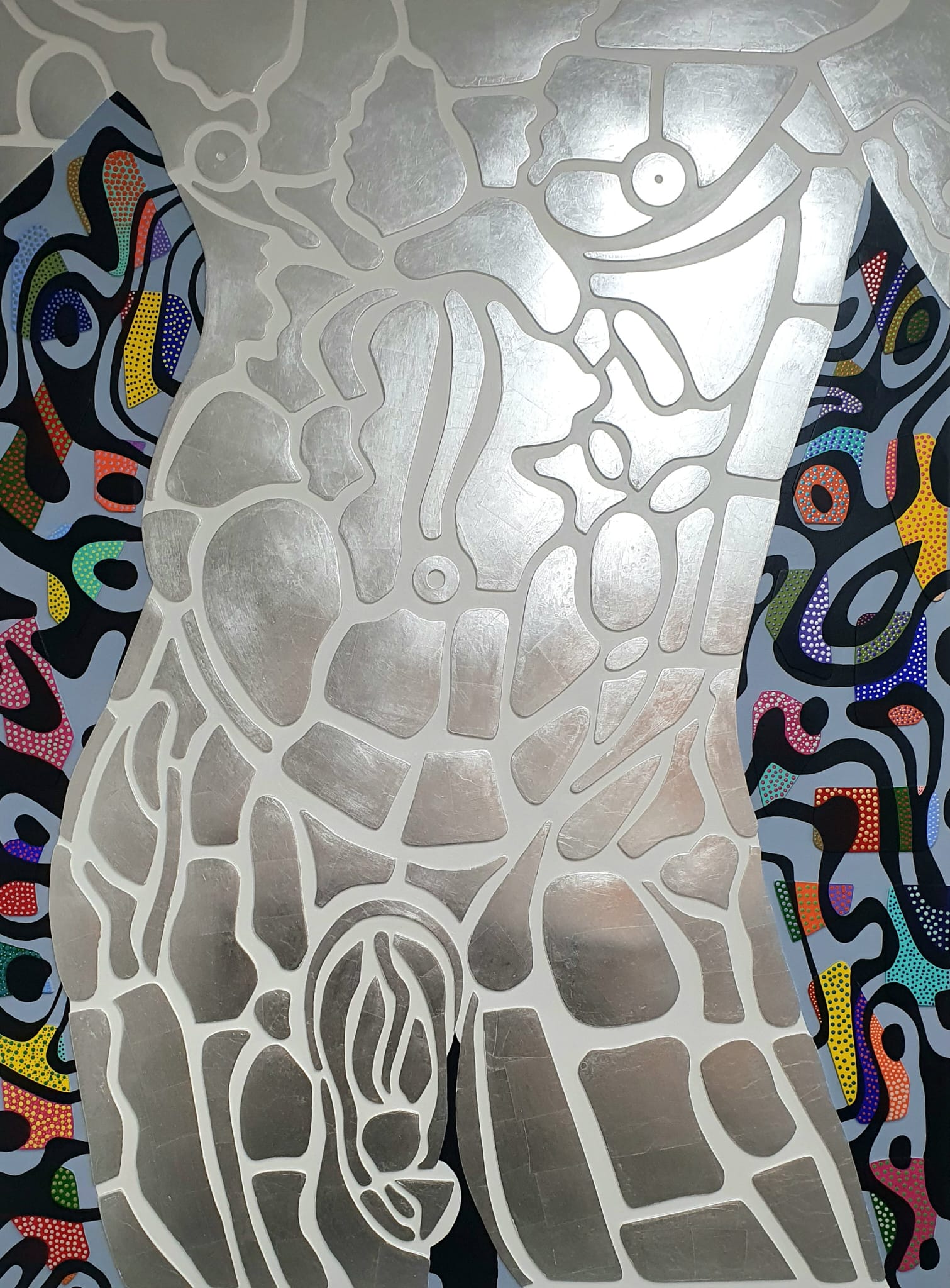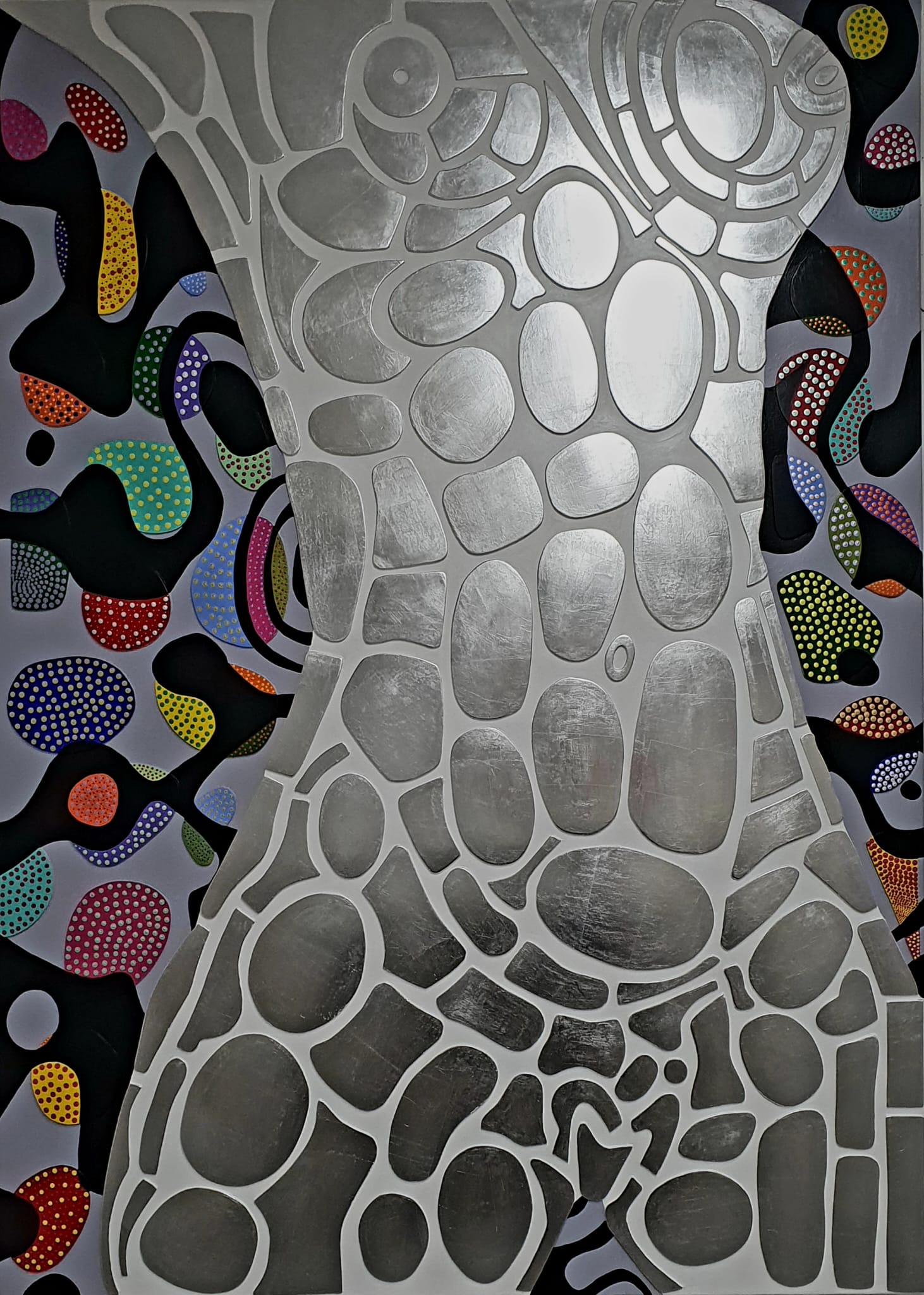 Ses œuvres, réalisées en techniques mixtes, intègrent des fonds métalliques ou texturés qui interagissent avec la lumière et accentuent la dimension physique de l’image. Les formes, fragmentées et articulées comme des cartographies internes, évoquent des architectures du corps, des systèmes naturels ou des topographies mentales, sans jamais s’imposer comme des représentations univoques.