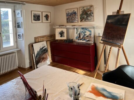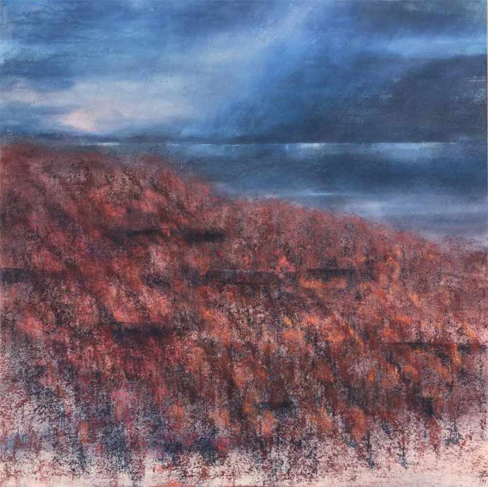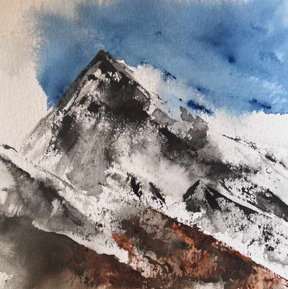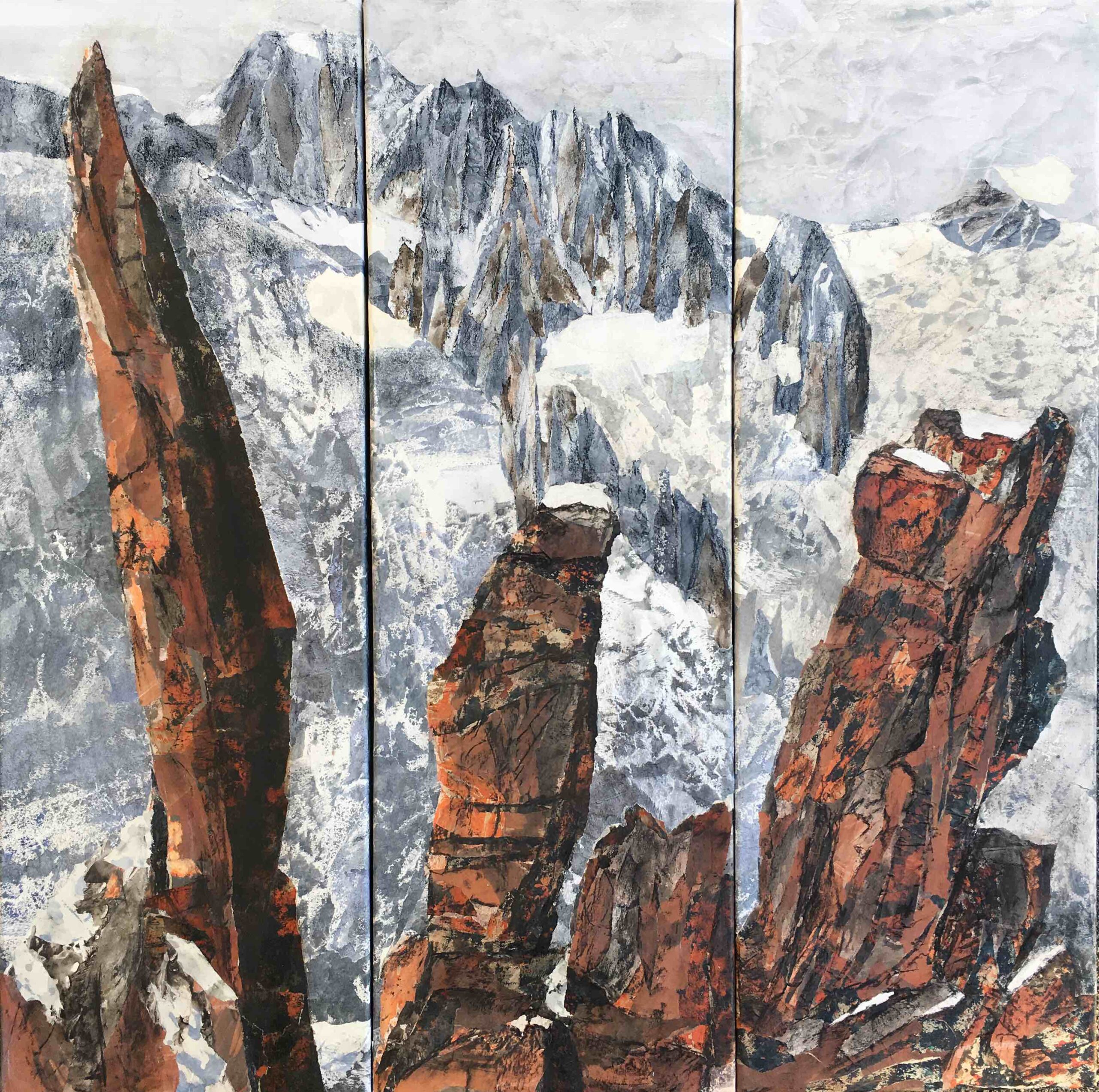 Aujourd’hui, fascinée par la diversité des outils numériques, j’ai imaginé des montagnes « revisitées » en superposant deux de mes oeuvres, imprimées sur de l’aluminium brossé, conférant à mes tableaux des reflets et des mouvements multiples. J’explore actuellement l’encre de chine et le pastel.