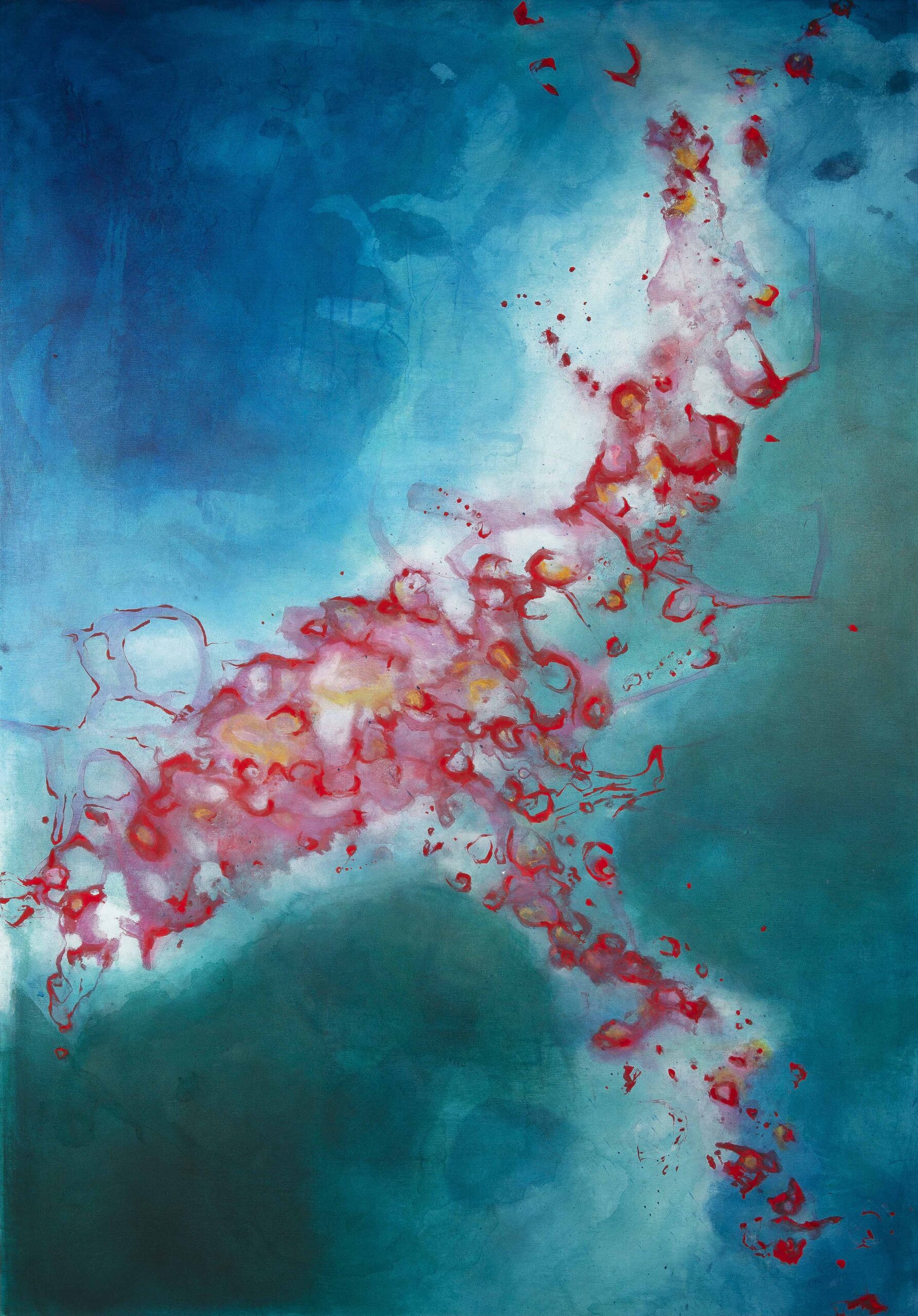 Ses toiles commencent toujours à plat, au sol. Le geste s’y déploie large,