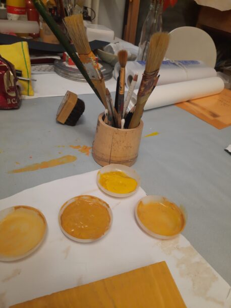 Attirée par les variations et les combinaisons de couleurs, Maude Sauvage nourrit une sensibilité particulière pour le jaune. Elle décline cette teinte, qui lui rappelle les fonds d’or byzantins, au cœur de ses estampes. Elle cherche à révéler la lumière, la chaleur, l’énergie vitale, ainsi qu’ une dimension sacrée et spirituelle.