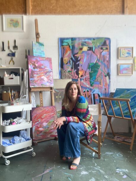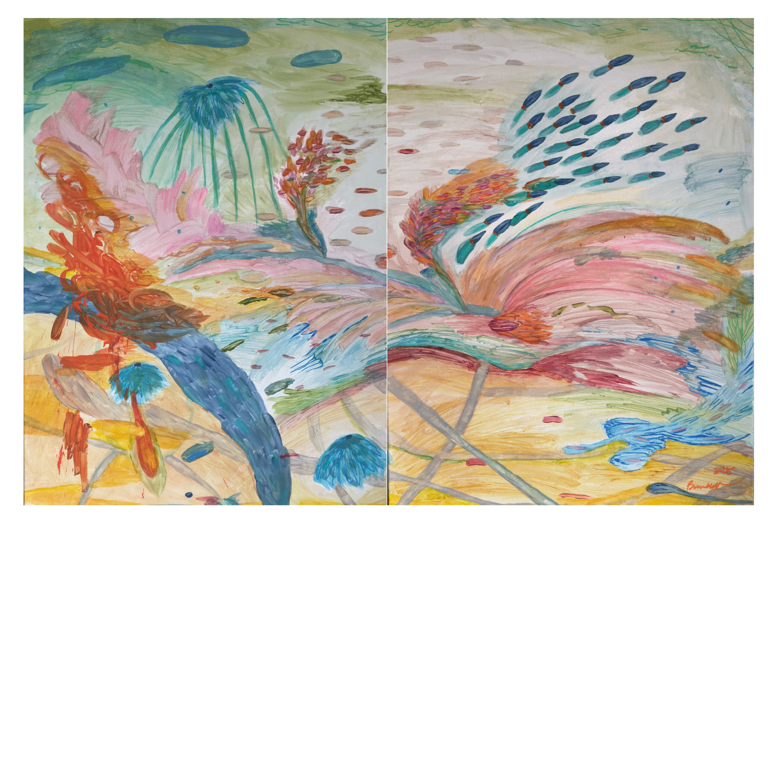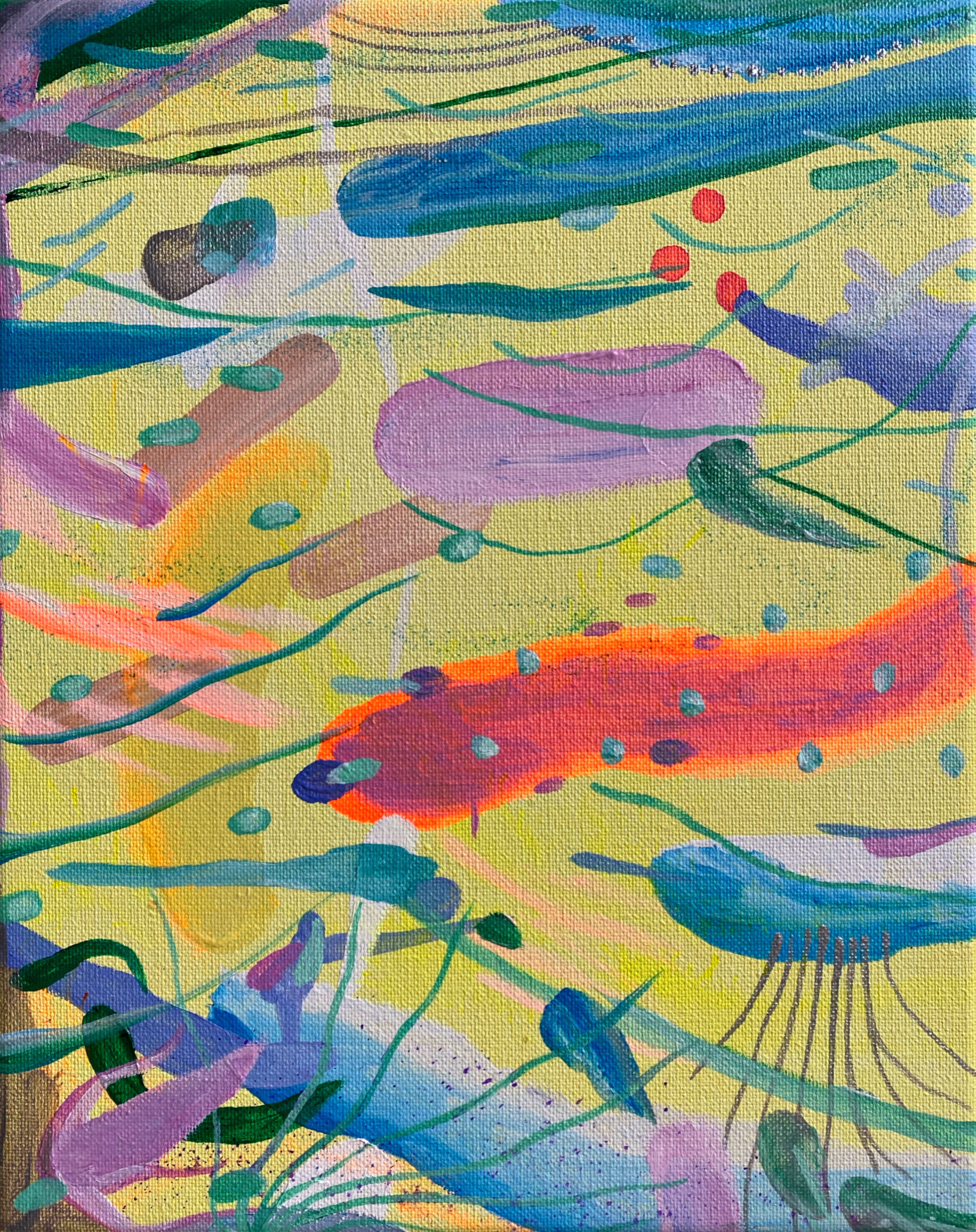 À travers la peinture, le dessin, la vidéo ou encore la céramique, elle crée des compositions vibrantes où matière, rythme et équilibre dialoguent comme dans un organisme en mouvement. Son univers, nourri d’observations microscopiques, interroge la frontière entre science et sensible, corps et cosmos.